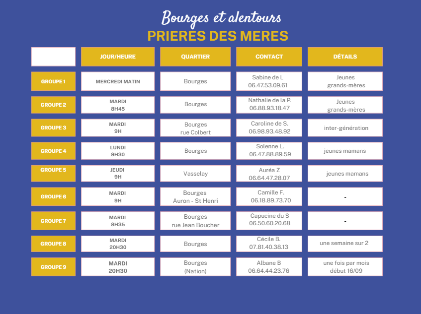 Ce temps de fraternité permet de confier au Seigneur les enfants, petits-enfants, que ceux-ci soient sur terre ou au ciel, ainsi que le père des enfants. Ces rencontres permettent aussi de ne pas s’isoler, de s’épauler dans la prière les unes pour les autres, de partager des joies, d’expérimenter la paix du cœur venue du Seigneur.